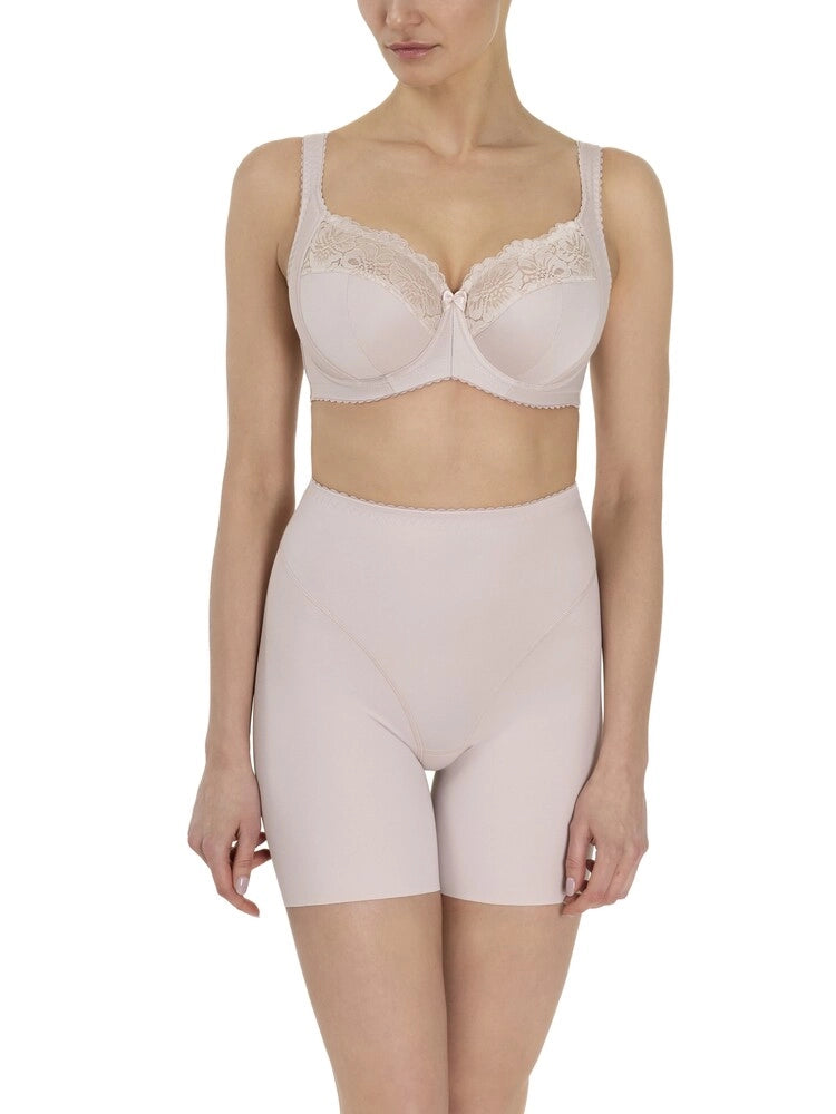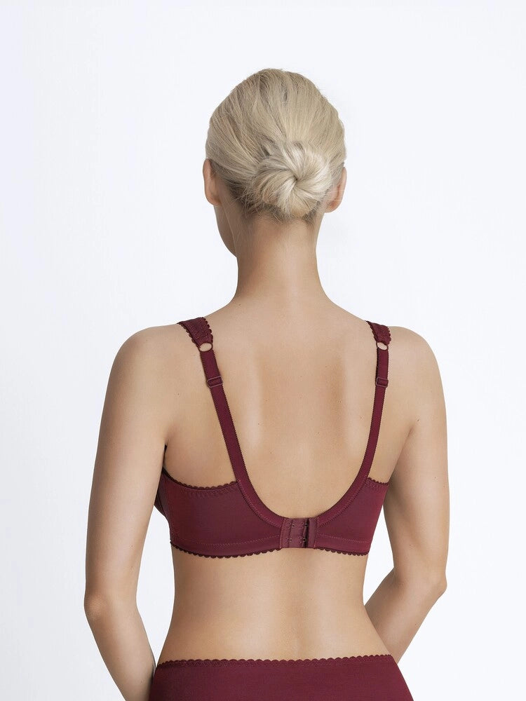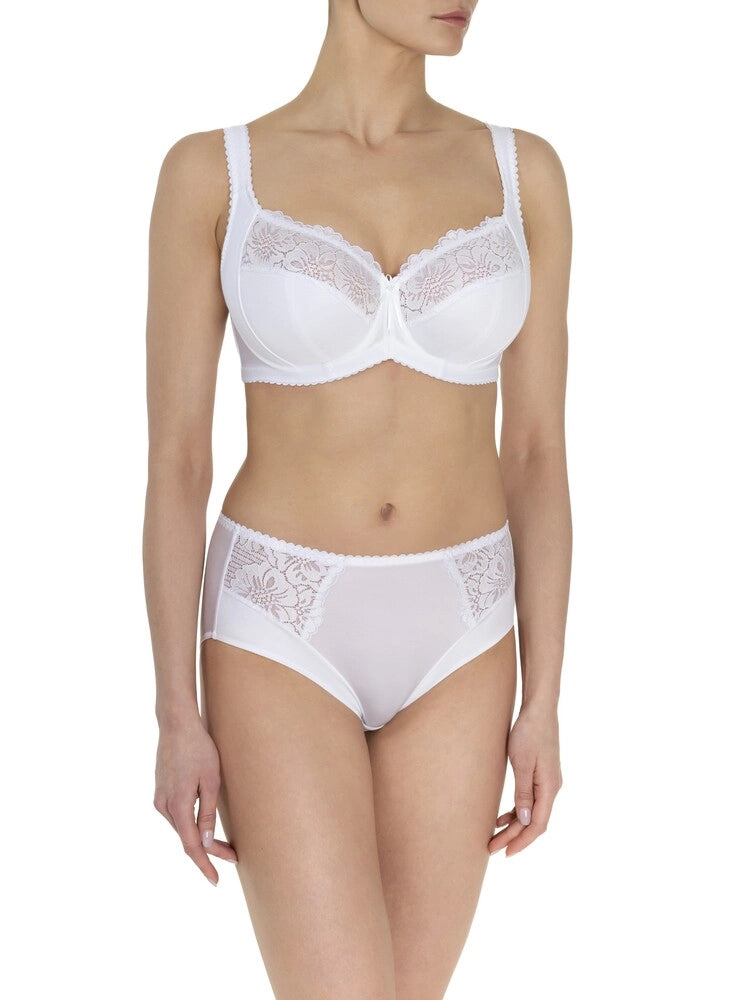 The universally flattering three-piece cup includes a side support panel that gently lifts and defines the bust for a smooth, rounded silhouette without added volume. For larger sizes, the bra features additional structural elements to ensure reliable hold and comfort: the cups are crafted from non-elastic knitted fabric layered with 100% cotton and topped with elastic lace for breathable, skin-friendly support.